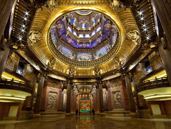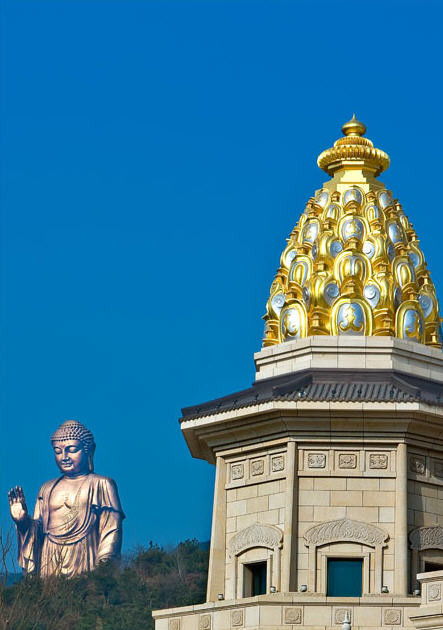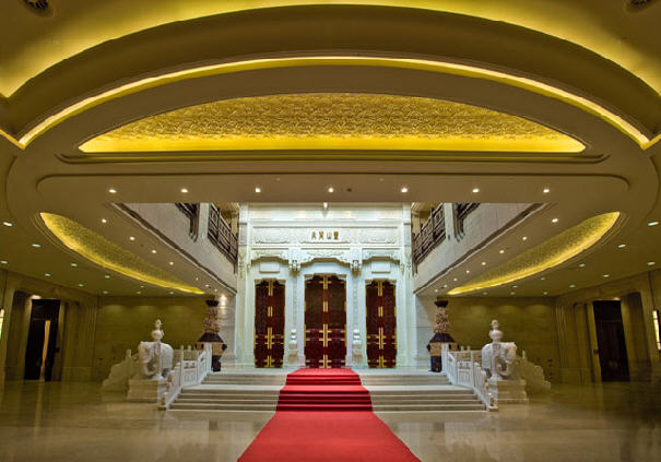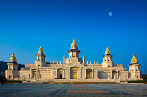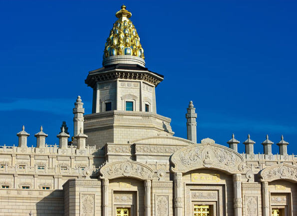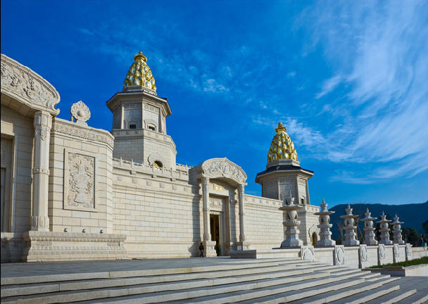 灵山梵宫坐落于烟波浩淼的太湖之滨,钟灵毓秀的灵山脚下,气势恢宏的建筑与宝相庄严的灵山大佛比邻而立,瑰丽璀璨的艺术和独特深厚的佛教文化交相辉映。灵山梵宫建筑气势磅礴,布局庄严和谐,总建筑面积达7万余平方米。灵山梵宫的建筑形式突破传统,以石材等坚固耐久材料为主,大量运用高大的廊柱、大跨度的梁柱、高耸的穹顶、超大面积的厅堂等,既体现佛教的博大精深与崇高,又将传统文化元素与鲜明时代特征相融合。