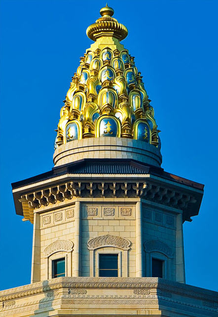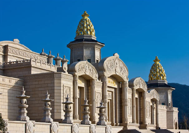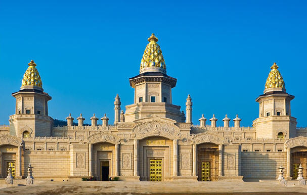 灵山三期位于灵山胜境景区东侧,工程以灵山梵宫为核心,南向太湖,依次分布着梵宫广场、香水海、曼飞龙塔、五印坛城等佛教文化景观建筑。以石材等坚固耐久的材料为主材建造的灵山梵宫,以南北为轴线,东西呈对称分布,面宽150米,进深180米,梵宫依山势进退而建,层层推进。梵宫内部各建筑空间独立且互相贯通,从南往北,依次分布着门厅、廊厅、塔厅和圣坛。东西两侧则为佛教餐饮区和会议区。灵山梵宫建筑形式突破传统,大量运用高大的廊柱、大跨度的梁柱、高耸的穹顶、超大面积的厅堂等,纵观灵山三期,景观布局庄严和谐,建筑外形气势恢弘,既体现了佛教的博大精深与崇高,又将传统的文化元素与鲜明的时代特征相融合,带给观者前所未有的心灵感受和难以忘怀的文化体验。