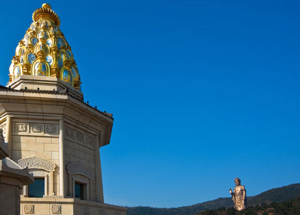 作为第二届世界佛教论坛的会址,整个建筑依山而建,糅合了中国佛教石窟艺术及传统佛教建筑元素,总建筑面积达七万余平米。作为东方佛教艺术荟萃载体的灵山梵宫堪称是东方的“卢浮宫”。梵宫内珍宝荟萃,光彩四溢,洋溢着博大精深的佛教艺术气息。整个廊厅为楠木雕刻而成,堪称世界上最大的楠木厅,仰望天顶,可以看到色彩变幻、精细雕刻的藻井。在廊厅的最深处,您将会看到灵山梵宫的镇馆之宝——七彩琉璃的华藏世界。穿越廊厅,十二幅巨幅油画诉说着古老的故事,缓缓道出佛教的渊源。梵宫中最宏伟神圣的地方莫过于圣坛,三维立体的舞台,上方是高度达30米的巨大穹顶,千余盏利用LED技术处理的,金光灿灿的莲花灯瞬间开启,刹那间千万盏明灯拱聚的圣坛,仿佛星光灿烂的天穹,仰望中,恍若置身浩瀚的宇宙之中,绮丽而唯美。由林兆华、何训田等组成的国内顶尖团队导演排练的,以弘扬传统文化、启迪心灵智慧为主旨的大型情境演出《觉悟之路》就在此上演,以最完美的声、光、电三种形式,为梵宫创造的又一惊世之作