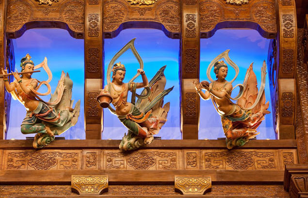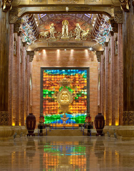 灵山梵宫拥有精湛细腻的东阳木雕,精美绝伦的敦煌壁画,姿态各异的当代飞天;灵山梵宫拥有“远看是画、近看是塑”的温州瓯塑,金光灿烂、错落有致的梵宫华塔,红墙金瓦、风铃声声的五印坛城;灵山梵宫拥有展示世界佛教文化交流发展史的大型油画组图,用皇家工艺“花丝镶嵌”而出的华藏世界,由1500多盏莲花瓣状的灯光共同组成、能做七彩奇妙变幻的圣坛穹顶……2009年1月1日,被国家旅游局局长邵琪伟由衷赞叹为“绝对精品”的灵山梵宫,将要正式揭开她的神秘面纱,亮出她所有的华美、瑰丽与新奇。