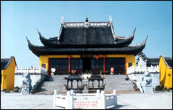 象鼻湾的正中是大雄宝殿,大殿在保持原有风貌的基础上,吸纳了苏式园林的建筑风格。殿宇巍峨,飞檐翘角,气势雄伟,十分壮观。“大雄宝殿”四字匾额是原中国佛协会长赵朴初题写的。殿内新塑八米多高的释迦牟尼佛像,安坐在莲花座上,两侧文殊、普贤二菩萨分乘青狮、白象。殿堂新塑的十八罗汉,金光熠熠,形态各异。大殿后新塑了海岛观音。观音大士周围一百三十八尊彩色佛像,飘然而降,乘风破浪,令人肃然。大殿四周栏杆,有数十对汉白玉石狮,目光炯炯,活灵活现。大殿正前方,建有释迦牟尼太子沐浴池,池内一泓圣洁之水,太子佛像耸立其间。他俯视人们的祈祷,祝福人间风调雨顺,国泰民安。