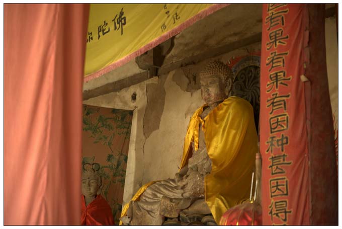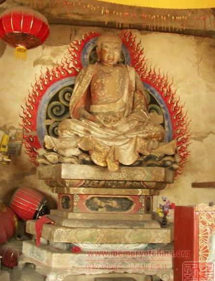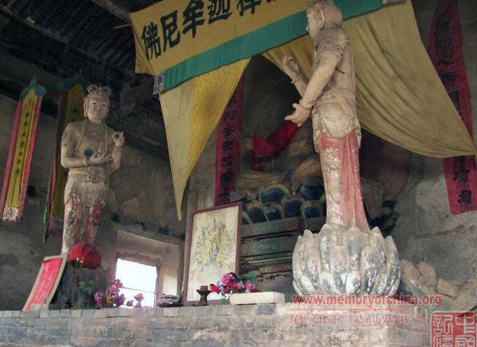 阁后为释迦殿(中殿,又称过殿),面阔进深各三间,平面几近方形,单檐歇山顶,为金代重建之原物。内供释迦佛、二弟子(迦叶、阿难),二菩萨(左右胁 侍)、六尊罗汉。后大殿,元建,面阔五间,进深三间,悬山顶,内塑一佛二菩萨。值得一提的是中殿的补间铺作,在令拱的两侧有向两侧的昂一样的装饰,此构建 在两天后看到的马村砖雕墓中也看到了,证明为本地区金代时期的一个“特殊”特征。