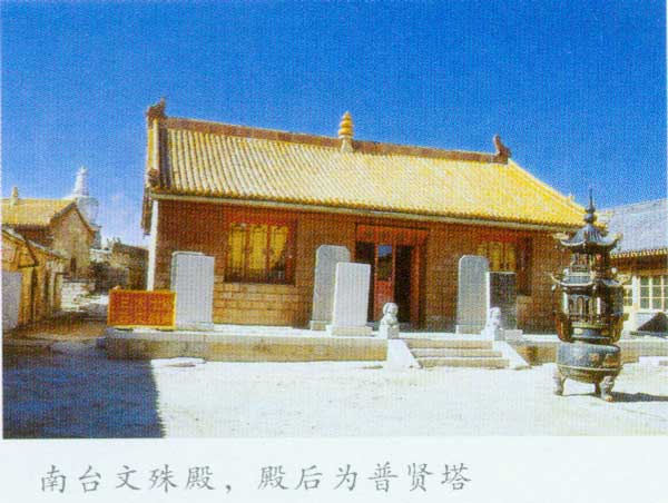 南台顶上现存寺庙一处,名普济寺。据《清凉山志》载;普济寺建于宋,明成化年间予以重修。性善诗中对普济寺有这样的赞颂:“策杖寻幽上翠巅,清凉春尽景 芳妍。千崖花缀千崖锦,五顶峰连五顶天。梵召绕陵日月,经堂寂寞锁云烟。真容欲睹知何在,极目苍苍意惘然。”这足以说明南台风光之秀丽。原普济寺内有明洪 武二十年(1387)晋王、颖国公等游台碑记和明万历二十八年(1600)、康熙五十三年(1714)修葺碑记。寺内3间前殿,内供脱沙弥勒佛像;5间正 殿为文殊殿,殿前有文殊画像碑;后殿为石窑洞3间,内置一尊石雕佛像和两尊菩萨塑像,其中,石雕普贤菩萨像,做工精细,色泽古朴,当为宋,元时期遗物。普 济寺现有三佛殿和后殿两处主要建筑,三佛殿内供横三世佛,而后殿内则供狮子吼文殊菩萨,佛相庄严古朴,笔触细腻遒劲。