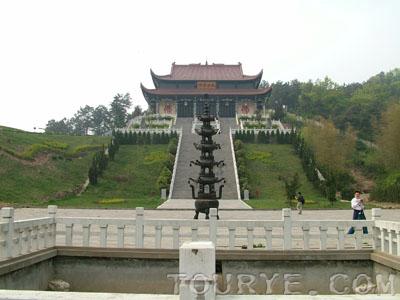 从广场到大雄宝殿,共有一百二十九级宽阔台阶。台阶两边也是汉白玉栏杆。从大殿向下,每个二十七级台阶有两个平台。第一平台是石雕九龙壁;第二平台是九凤壁,平台左右各一头石雕麒麟。