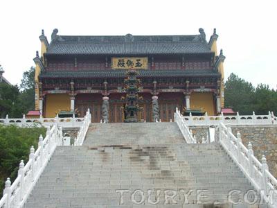 车道右边是三层11间的宾馆,一楼中间是地藏殿,九华山大愿地藏王菩萨暂位于此。宾馆左边是五间厨房,内设斋堂;右边是“玉佛殿”,内供国内罕见的三尊玉佛。由天津居士出资从缅甸请来。大殿气势雄伟,向下有九九八十一级台阶,皆是汉白玉栏杆。“玉佛殿”右边是规模宏大的三层居士林念佛堂,对面是华东第一露天大佛——阿弥陀佛。高21米,重达300多吨,由135件花岗石构件雕刻组合而成。露天大佛正面是一个正方形的广场,长条石铺地,四周白色水泥栏杆,里面一字摆放铁铸香炉和烛台,正前方是四大天王花岗石塑像,从广场前十八级台阶,是一个更大的广场,两个广场相连接,可供上万人同时礼佛。广场前面是水泥花砖铺道,分割开六块大草坪,草坪上栽有“银杏”“桂花”等珍贵树木,布局整齐,翠绿花香。