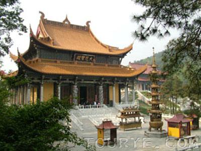顺着石佛边的车道,稍一拐弯,直通山上大雄宝殿,途经过一个正方形放生池,池不大却深,白色的水泥栏杆护沿,池中四角处石雕四龙挥首,妙趣横生。经过池边,便是大雄宝殿前的广场,广场中央,高耸着铁铸宝鼎,宝鼎古色古香,高五层,庄严、肃默。