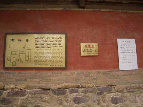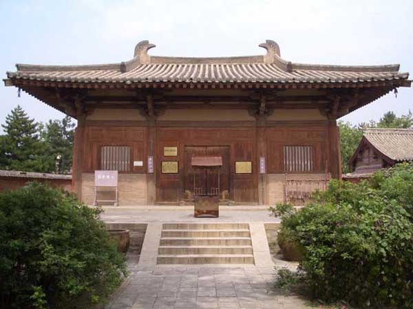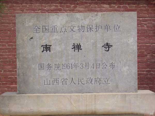 南禅寺,始建年代不详。据清嘉庆二十五年(1820年)《补修 南禅寺碑记》云,南禅寺原由郭家、李家庄二村为至五台山弘传南宗禅的僧人驻锡所建,故名南禅寺。现存大佛殿内横梁题记云:“因旧名,时大唐建中三年,岁次 壬戌,月居戊申,丙寅朔,庚午日,癸未时,重修殿。法显等谨志。”唐德宗建中三年(782)、寺僧法显等鼎新寺宇,彩塑了“华严三圣”。寺名仍旧,但禅寺 变成了华严道场。以其地处偏僻,距五台山佛教中心区较远,又是一座不见“志书”的小庙,因此避免了“会昌发难”这一灭佛之灾而幸存下来。南禅寺又经五代战 乱,但宋、金、元、明没废修葺。乾隆二十九年(1764年),两村纠首郭旺、姚文禄等15人和住持照宓等6僧合力鼎新寺宇,到嘉庆二十五年(1820年) 时,住持木玖、惟怀师徒和村民一起集资,又修复了寺宇。解放后的1961年,国务院将南禅寺公布为全国重点文物保护单位。1974年,国家又拨款将大佛殿 照原样进行了落架大修。