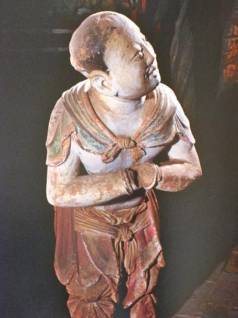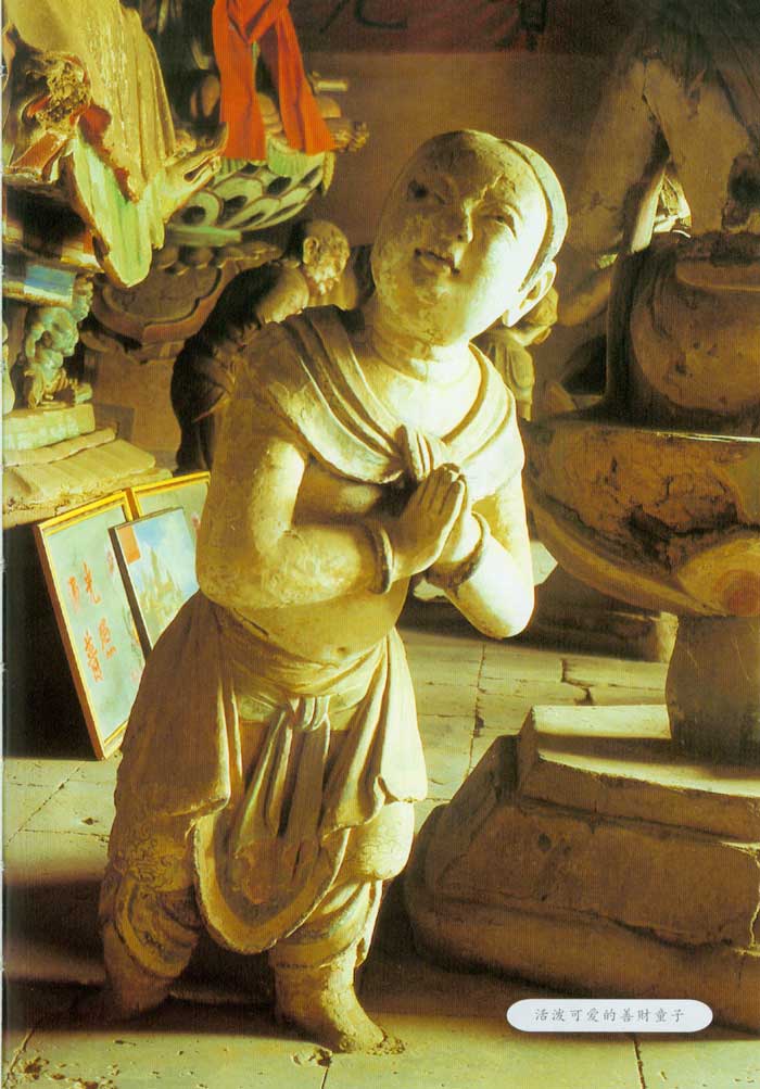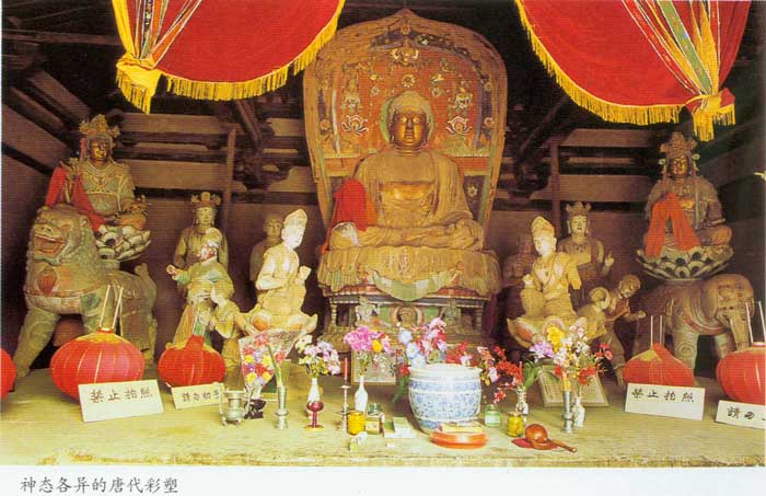 大佛殿内保存有精美 的唐代雕塑。殿内砖砌坛长8.4,宽6.3米,高0.7米,四周壶门和迭 上,嵌有70幅唐代砖雕,雕刻着人物、动物、花草。佛坛上,有本尊释迦牟尼佛、 文殊菩萨、普贤菩萨及释迦二弟子迦叶、阿难等大小唐代彩塑17尊。这些彩塑主次分明,尊卑有别,动静结合,生气盎然;塑像躯体丰腴,比例适度,面目丰润, 形态逼真,服饰简洁,衣纹流畅,手法简练,色调明快;同敦煌莫高窟唐塑如出一辙,为唐代艺术的典范,也是五台山最古老最精美的雕塑,反映了我国古代劳动人 民卓越的智慧和才能。