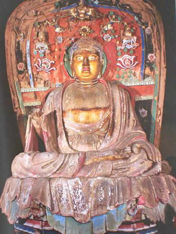 大佛殿为南禅地主体建筑。面阔3间,宽深见方,均为11米。座基方整宽广,几乎占了整个院落的一半,大大突出了大殿的主体地位。殿为单檐歇山顶,梁架举 折相当平缓,是我国现存古建筑中屋顶最平缓的一座。出檐深远翼展,刚健轻巧。殿正中间开门,两尽间设直棂窗,朴实无华。殿周围由12根大柱支撑,柱体粗壮 结实,柱头使用斗拱,无补间铺作。斗拱用材硕大,拱头券刹都为五瓣,每瓣都向内 约3厘米,为我国木构建筑中的孤例。殿内平梁上不施矮柱,仅用两根叉手 承托脊 ,十分简洁有力,保持了汉唐之际固有的建筑特点。整个大殿建筑坚实、质朴、苍古、秀雅,反映了唐代的建筑风格。