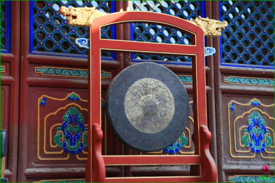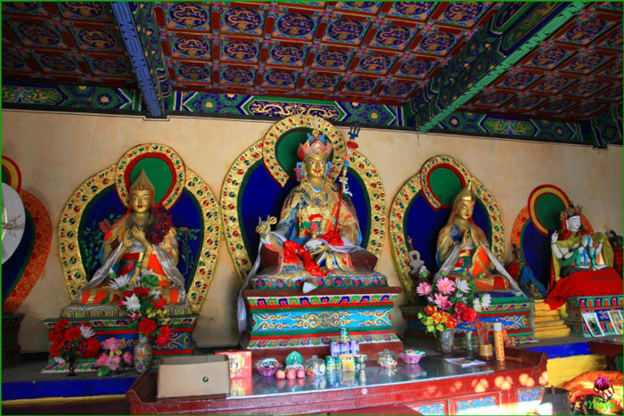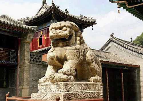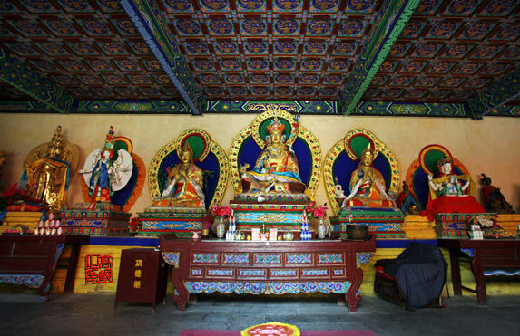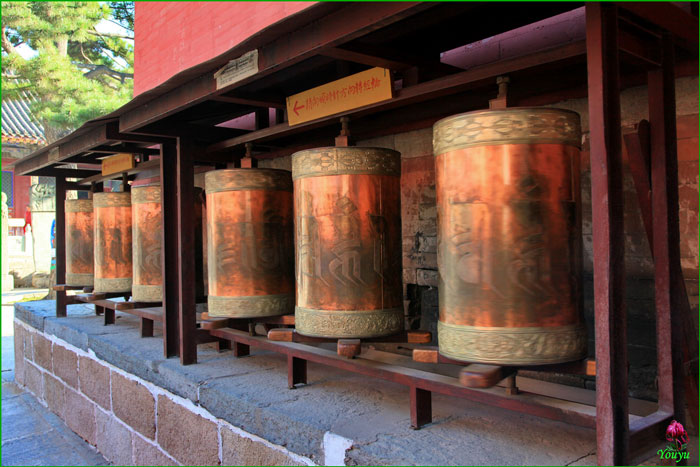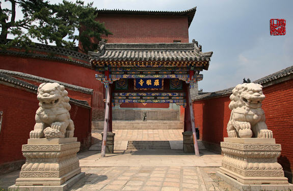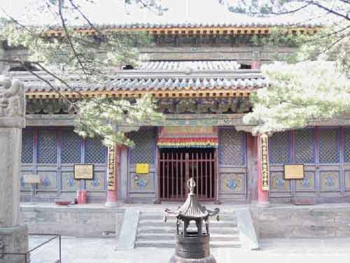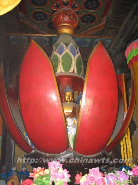 顺弯曲的夹墙石道来 到山门前,门两旁的石狮,一雄一雌,硕大雄浑,威武壮猛。台怀中心区诸寺多雕有石狮,而唐代的遗作惟有此一处。山门里一共四重大殿。这第一重为天王殿,内 塑四大天王,也称四大金刚,分别是抱琵琶的东方持国天王,持宝剑的南方增长大王,缠长蛇的西方广目天王,持雨伞的北方多闻天王,民间称他们为风(持剑 者)、调 (抱瑟琶者)、雨(持伞者)、顺(握蛇者)四神。第二座殿为文殊殿,内供文殊菩萨,不同于一般青庙,这里的文殊菩萨面部为乳白色,而非贴金黄色,肩膀两边 伸出了肩花,花上还放置了经书和智慧剑,文殊坐骑是卧在莲花上,而不是站立砖台。这些都体现了黄教文殊造像的特点。第三座为大佛殿,内供释迦牟尼佛 (人间婆娑世界)、药师佛(东方琉璃世界)、阿弥陀佛(西方极乐世界),合称“三世佛”。三世佛前为胁侍菩萨和供养菩萨。第四重殿里的“开花现佛”最具神 秘色彩。殿内正中高竖一朵莲花,内含四尊佛像,有时八瓣莲花会缓缓绽开,现出四方阿弥佛。其实,这是巧设机关人工操作的结果。这大莲花与下面的大圆盘用通 柱连在一起,当僧人在圆盘下的暗室驱动木轮,通柱即会转动,莲花随之开启或闭合,遂出现“开花现佛”景观。另外,在圆台上塑24个神像,称“二十四天”。