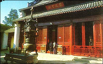 这些建筑都不在同一中轴线上,比如山门殿,坐西面东而建,而天王殿和圆通宝殿则坐北朝南,你正以为无路可走时,绕过偏殿 ,则入紫竹林,登几级台阶,又见迷楼出现在你面前。古代墨客勾勒过这里的景致:“楼阁高下,轩窗掩映,幽房曲室,玉栏朱木盾,互相连属,回环四合,曲屋自通,千门万户,上下金碧。”其特点之二是险,寺处山巅,以块石垒基,建筑皆气宇轩昂,崇楼杰阁。山下仰视,悬崖上危楼对峙。这里的树林叫“云林”,此处的池塘为“天池”,此处的楼为“摘星楼”。高宗南巡时,曾赐一联“渌水入澄照,青山犹古姿”,横批“峻拔为主”将其险峻之态恰当地概括出来。