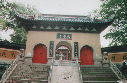剑阁,原为明御史钱籍所建,原阁已废,八十年代重建两层新阁。厅内挂钱籍所作言公达书之楹联:“绝壁剑开,伊阙羊肠应让险;重湖镜列,洞庭彭蠡合争奇”。除此联外,阁内又增一新联为钱仲联所作:“蜀阁称雄,佛掷陶家轮,剑北分来峰一角;尚湖绝代,人在水精域,镜中为照月千。”上下“剑阁”匾额分别由江渭清、柳林题书。 此外,三沓石、牛窝潭(原万松庵处,有瞿式耜墓)、长寿桥、霸王鞭、松风亭等古迹新景环布禅寺左右,为山水增色,受游人赞赏。乡先贤俞钟颖写藏海寺外胜景有云“危虹横卧之险,奔流倒卷之奇,石传三沓之形,庵忆万松之胜。‘烟岚高旷’,宸翰常留;香社喧阗,春台共乐。”洵非虚语。三藏海寺自宋代肇始,下迄明清,屡经兴废。二十年代由辛北山人丁易编辑之《虞山藏海寺志》对该寺史乘记载详备。抗日战争期间,早年积极协助住持澈尘和尚之监院、编修寺志最力之戒非和尚,惨遭日寇杀害于寺院。十年浩劫期间,藏海寺除明代所建报国院山门独存外,其余均被毁坏一空。随着大地回春,诸凡顺遂,市佛教协会经过充分酝酿,报请有关方面领导于1991年6月批准,1992年5月奠基,历时五年,耗资850万元,终于于1997年成功重建藏海禅寺,并于当年10月举行了隆重的开光仪式。 焕然一新的占地达15亩的藏海禅寺,如今又雄踞虞山绝巅,并且更见辉煌。 从长寿桥向北数十步,山门之前有低涧,上架拱形石桥名香花桥,石桥两侧各有联语,一曰:“弓影腾空,流通万壑;花名独表,香透重门”、一曰:“雁齿横排,云烟出没;虹腰高卧,泉石奔腾”。不仅实写出寺前景色,而且以禅语引发佛理,引人入胜,举步即可进入庄严法界。 藏海寺现山门原为报国院之正门,为仅存的明代建筑。九十年代重修时,改为藏海寺的山门,而将报国院真武殿西移重建于今址。门额“藏海寺”三字为中国佛教协会会长赵朴初亲题。两侧有于右任早年手书唐王维《青龙寺》联语:“山河天眼里;世界法身中”。笔走龙蛇,金碧辉煌。 藏海寺山门内正中广场,古银杏树高耸入云,宝鼎中香烟不绝。藏海寺大雄宝殿今已题名为“普光明殿”,庄严雄伟。赵朴初为大殿题“三千觉路”匾,楹联为钱仲联撰书,语曰:“自天水建庵,石劫几回经,法日重光千祀后;当赤明开纪,化城弹指现,蜀峰飞到一灯前。” 普光明殿中如来佛像,法相庄严,一尊玉佛,由信女王凤和捐资6万,余则由兴福寺出资恭请。殿中护法诸天和大悲殿中的千手观音像均由浙江宁波佛像研究所塑制。 高踞山巅之佛寺何以名为“藏海”?以往《虞山藏海寺志》对此未有说明。此番钱仲联撰《重建藏海寺碑记》有云:“藏海者,莲花藏世界海之简称也。”并引《大方广佛华严经》曰:“有须弥山微尘等风轮,持此莲花藏庄严世界海,最上风轮名胜藏,持一切香水海,彼香水海中,有大莲华,名香幢光明庄严,持此莲华藏庄严世界海。”据此可见藏海寺大雄宝殿之名,其源亦出《华严经》,极为相称,更胜往昔。 大殿之东“大悲殿”匾由赵朴初题额,东有 “三藏法轮”匾,谢稚柳所题;殿内有 “众善奉行”匾,启功题。茗山法师为此殿题写楹联:“无我相无人相无众生相无寿者相;有悲心有慈心有欢喜心有大舍心。” 大悲殿再向东原为拂水东庵址,现辟为东园,草坪、水池、曲廊、花木,参差起落有致。乾隆年间《祖师庙归僧收管碑记》及1995年《重建藏海寺碑记》分别立于曲廊之壁。举凡寺庙沿革、历代废兴、重建经过以及景观特点、命名含义等均有概记。两件新旧文物,成为寺庙之历史见证。 藏海寺向西一墙之隔为报国院,院内有真武殿,殿前另有庭院和殿门。殿宇正中供奉真武神像,由信徒自发送供。左右有重翁所撰楹联:“灵殿溯明清,德被严相堂前,庶民仰止;洞天揽吴越,风回尚父湖畔,尘世肃然。” 如今,堂殿轮奂,金碧檀栾之藏海寺,与烟岚高旷、天花雨空之拂水晴岩,一起随时代生色增光。万方登临,近山遥水,青白萦绕,湖山重光,名迹再现。我历史文化名城旧观复兴,万众称庆,人天欢喜。游 藏 海 寺