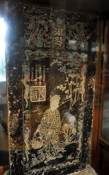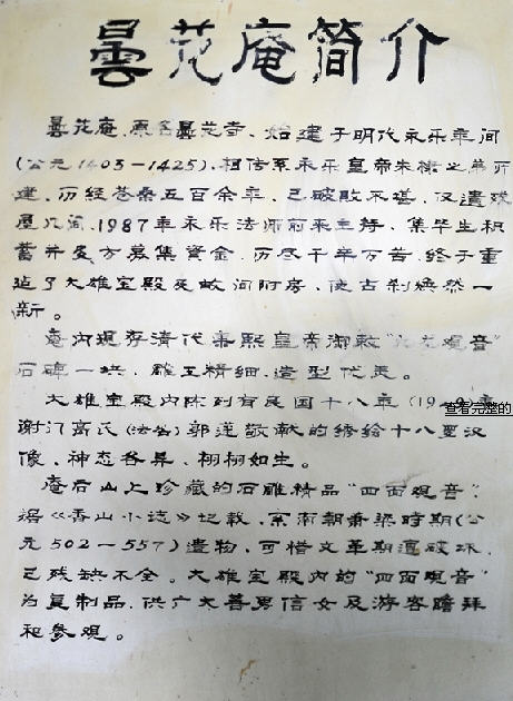 庵内有被称为“镇庵之宝”的明刻观音菩萨碑。碑体布局巧妙,颇具艺术价值。观音右手提一只细方格纹浅口长把花蓝,蓝中置一条昂首翘尾的鲤鱼。释家称其为“鱼蓝观音”,俗称为放生观音,为佛教三十三体观音形像之一。