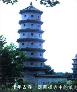 定善禅寺在江苏省宝应县曹甸镇古塔村境内,始建于公元400年,开山为东晋安帝时世称辩才的学问僧德聪,距今已有1600多年,是苏中地区现存最早的佛教寺庙。定善禅寺有三座山门,东为文武殿,西为城隍庙,定善禅寺居中,三者一体,前后有房共99间半,殿宇巍峨,楼阁参差,雄踞古泾河北岸。寺内外古迹颇多,大小两座宝塔,以镇海塔最负盛名。寺后一株古银杏,周长一丈,枝繁叶茂,垂乳数十,虽年年纸课焚炙,均未受损,人以为异。六十多年前被锯倒,然而天不灭此树,伸向四面的残根吐出新芽,历经风风雨雨,化作6株顶天立地的大树,依傍双塔,环绕古刹,形成一派葱茏茂密气势恢宏的丛林奇观。