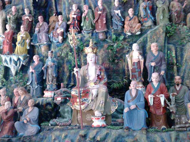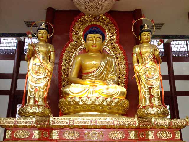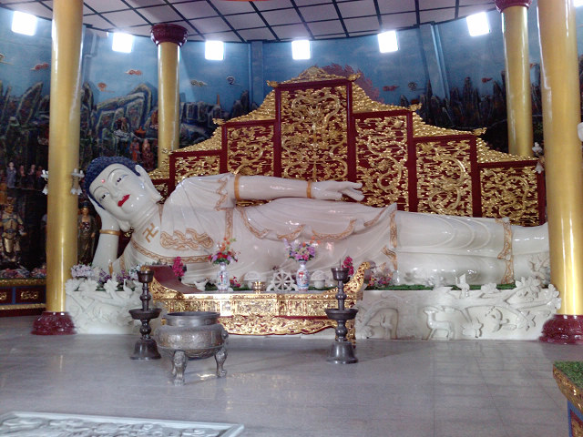 这座禅寺院落众多,和其余同类寺院建筑结构大体上没啥差异,这里最具有特色的是主体建筑--“祥和殿”,该殿像个金光闪闪的半球扣在地上,共分三层,两边有露天环形楼梯通达。一层是日常法事举行区域;二层是核心参观区,这里正中央是一尊巨大的白玉释迦牟尼卧佛,四周密密麻麻围绕的是浮雕形式各种各样的彩塑佛像,估计万佛的由来就是这样的吧,我佛学知识浅薄,只认出了唐僧,他手执禅杖,端坐其中;三层正门是三尊金光闪闪的佛像,中间端坐莲花台的是如来佛祖,旁边两个站立的估计是观音吧,别看这里佛少,但都是顶级大腕儿,“千拜万拜不如这里一拜”,我虔诚的叩头三拜祈福。