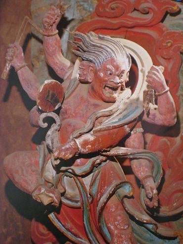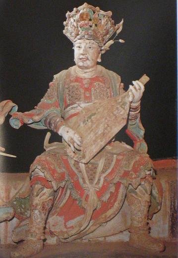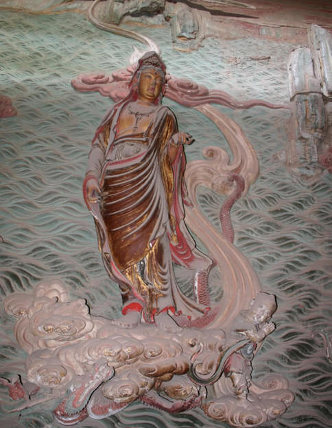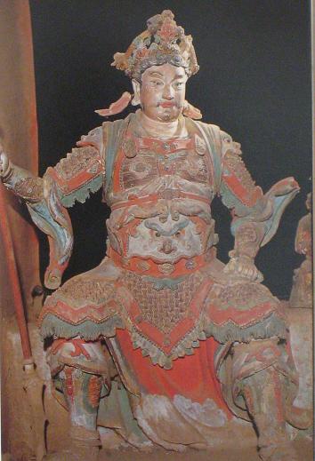 弥陀殿,五间见方,四周围廊,重檐歇山顶,五铺作双下昂斗拱,梁架四椽袱与后乳袱在金柱上相互搭交,为元代遗构,记载为明弘治年重修。殿内塑有弥陀佛及 胁侍观音、大势至。在弥陀佛宝座的背后,悬塑有南海观音、善财童子、明王及供养人等。彩塑为宋代风格,雕塑精美,艺术价值极高。体态丰韵,眉目清秀,和蔼 可亲的南海观音脚踏一朵“朝天吼”托扶的祥云,飘然而至,其侍者善财童子形影不离,被佛家视为有智力、有威望、能征服一切恶魔的明王也紧跟其后,背景为波 滔汹涌的大海。作者运用有透视感的祥云曲成表现观音乘风而来过海的仙气。运用浅墨绿的彩装,表现海的广阔和汹涌。利用高、低浮雕塑出海浪图案。在平面背景 上,增强了彩塑的立体感。处理手法比较独特。弥陀殿内两侧,有金代补塑18等罗汉及明代加塑的四大天王。罗汉神态各异,举止无定,坐卧自如,栩栩如生。寺 内四大天王,各有名号,而且服饰、法器各有区别,东方持国天王,身为白色,手握琵琶;南方增长天王,身为青色,手持宝剑;西方广目天王,身为红色,手握幡 龙;北方多闻天王,身为绿色,右手执伞,左手拿银鼠。民间称其为“四大金刚”,又说分掌风、调、雨、顺。