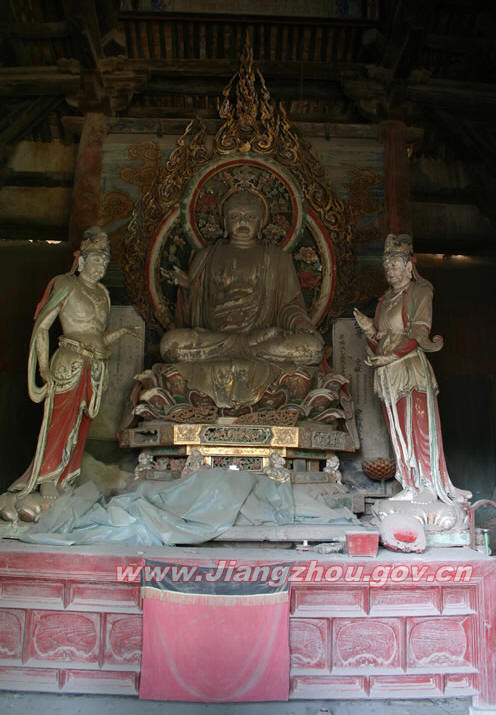 后大殿,又称藏经阁,共七间,上下二层,上层藏经阁,下层三佛洞,洞内塑有释迦及胁侍观音、地藏,弥陀及胁侍文殊、普贤,药师及胁侍日光、月光菩萨。均为元代彩塑作品,由于没有对外,保护极好,整个彩塑如新塑一样。具有极高的艺术价值。