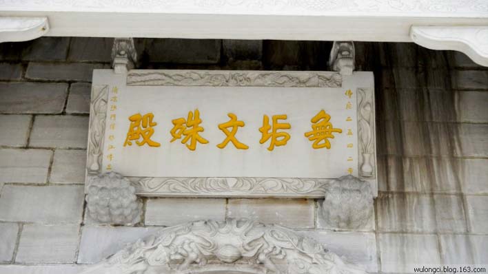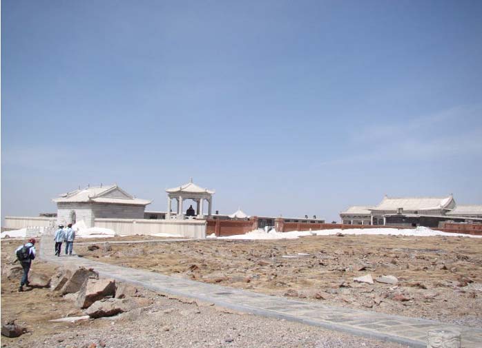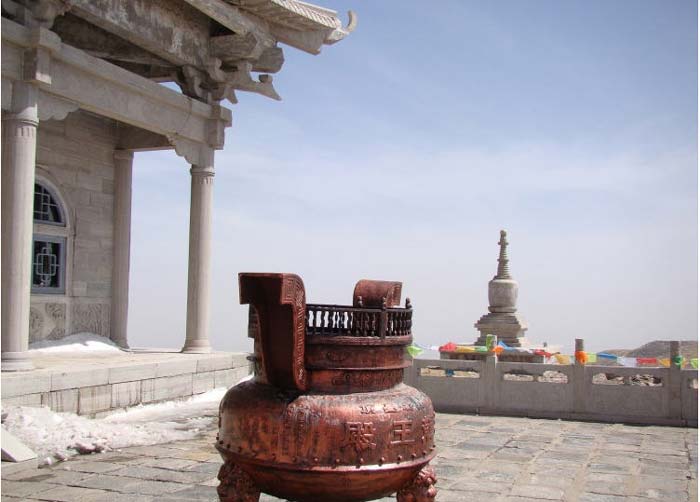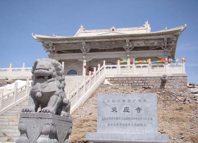 北台顶的寺庙,名 叫灵应寺。灵应寺创建于隋代,坐北朝南,原有山门三间,门额悬挂“敕建大台北顶”巨型匾额。东西两间,内置石碑各3通,石碑记载了历代对灵应寺的兴建等情 况。沿山门向北为“北极玄宫”,即灵应寺过殿。原殿内正面有韦驮菩萨像,韦驮菩萨四周有坐佛8尊。民国年间李相之的游记中对灵应寺有这样的记述;两殿摆 设,都很整齐。正殿5间,特别高大,所用木料,都很笃实。殿顶的瓦是黄绿色琉璃瓦,砌成棋盘形。门额巨匾上书:“毗卢真境”,为康熙八年(1669)立, 明代隆庆年间(1567-1572)曾对灵应寺予以重修,1986年又重修葺,正殿为3间石洞,内供无垢文殊菩萨。2001年,灵应寺再度扩建和维修。新 建文殊殿5间、龙王殿3间及石牌坊一座,均为汉白玉石砌筑。大殿单檐歇山顶,门窗拱券,前置廊,门前左右各置石狮1尊,左右偏殿为悬山顶,廊间柱头饰以石 制斗拱,整体设施简洁明快,稳重大方。龙王殿置于2米高的高台上,面阔三间,拱卷式门洞,也是单檐歇山顶。殿前有汉白玉石雕护栏,护栏栏板浮雕各种各样的 花卉、草叶纹饰,极为壮观。