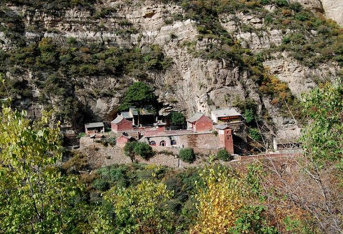 离开北洞建筑群前往“古 南洞”,要翻过中部山岳一个林荫蔽天的小山包。善男信女南来北往,络绎不绝。古南洞位于中部悬崖的南腰,禅房前有一条宽不足两米的露天走廊,抬头仰望危崖 凌空压顶,低头俯视深涧幽谷生风。入禅房,迎面后壁墙上有一小门,乍看好像壁橱,细瞧乃是洞门。启门躬身钻入洞中,漆黑拐弯登上狭窄的石级,再推开地道的 内门而入,眼前出现一间石壁石顶,窗明几净的洞窟式居室。这里就是佛教所称的“自在禅”。