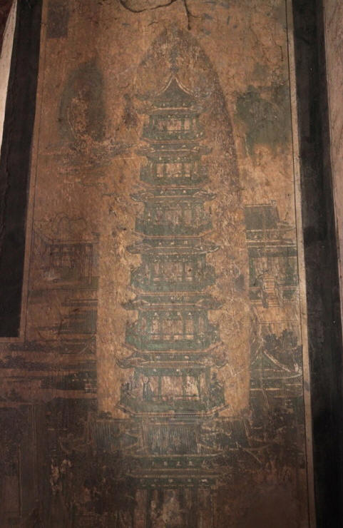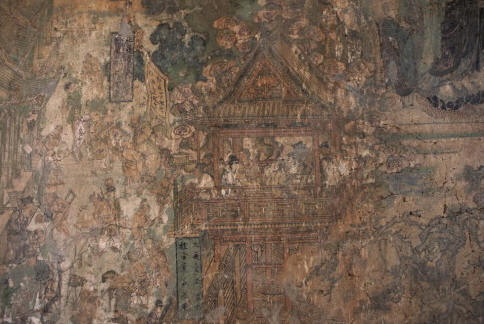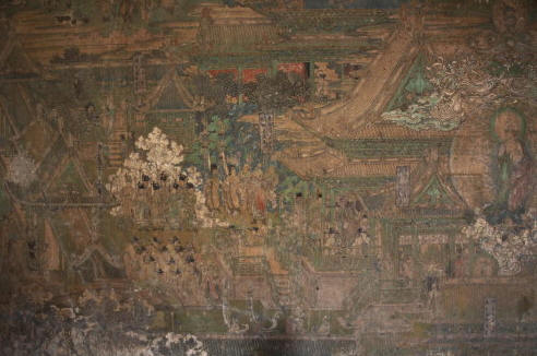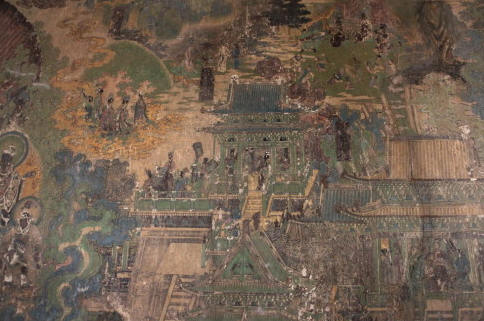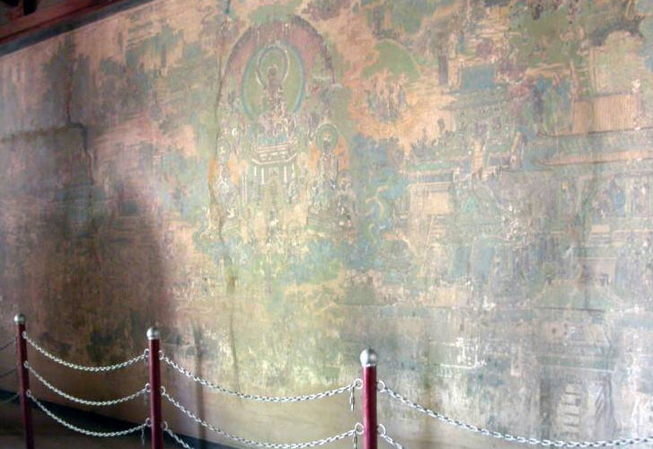 南殿壁画原有一百三十多平方米,只可惜,由于年九失修,损坏了不少,现在尚有九十多平方米保存了下来。西壁上绘的是佛祖传记故事,壁面主要绘一组完整的 宫城,楼台殿宇,悉如真境。在宫殿、配景中,以插图的形式描述了释迦受胎、降生、沐浴、角力、云游、出家、苦修、成佛、度化、说法、涅磐等经历,使人们对 佛祖的一生有直观的认识。中壁正中是释迦像,两侧为本生故事,讲述了佛祖在成佛前经过多生累劫的行善,故事非常感人。