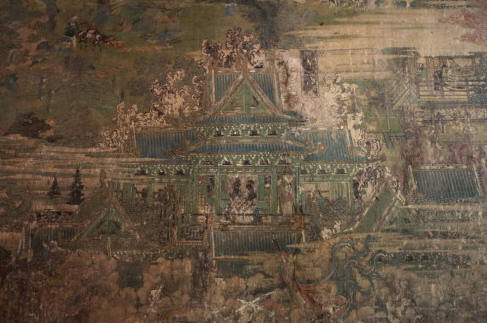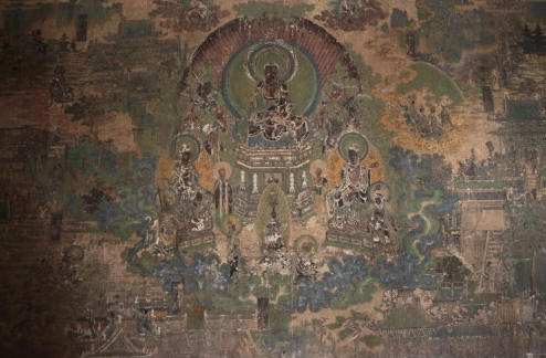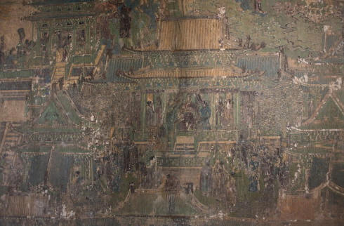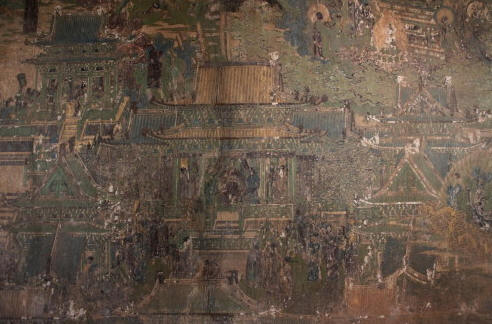 文殊殿西次间的壁画表现的是五百商人入海求珠、遇海啸狂涛、坠入罗刹国的故事。罗刹国的故事。罗 刹国,食人之鬼所住所,在大海之中若有人称念观世音菩萨名号,就能解脱罗刹之难。壁面上一只大船正扬帆行驶在大海之中,风卷浪飞,船舶颠簸,把五百商人吹 坠于罗刹国中。食人鬼罗刹女扮作美女前来营救,欲一一食之。幸好,观音菩萨及时赶到,五百商人化险为夷。该壁画总面积约七平方米,有海市蜃楼、航海遇难、 门前迎宝、商贾被囚等图景组成,其中的海市蜃楼用淡墨白描工绘,比例精当,透视准确,门庑、回廊、平台、高阁、楼阶、抱厦等无不完备。这幅壁画不仅是中国 金代绘画红的精品,也是中国古代建筑图样中的一则蓝本。
