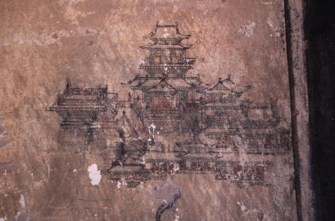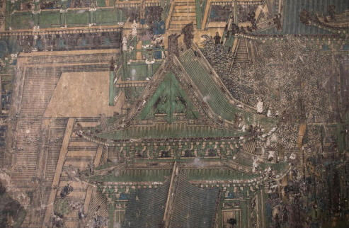 西壁南隅的酒楼石等,是岩山寺壁画中又一精彩场面:河流之上,建 酒楼一座,歇山式屋顶,四面敞明,形如方亭之制。楼内有桌凳,门外挂招旗,上书“野花攒地出,村酒透瓶香”,用以招揽过路游客。楼内品茶饮酒,说唱卖艺及 凭栏赏景者满堂,其中一位女子,发型弯曲,躬身向前为倾,好象正在演唱。酒楼门外是商贩聚集区,有的在为顾客操刀切肉,有的提着两条大雨回家,有的因烈日 当头而为主人撑着伞盖,有的捧着鸟笼,有的头顶罐盘。除此之外,还有盲人、官贵、赤身露体的婴儿和四方游历的僧侣。这种街中闹市的繁忙景象,确切地反映了 北宋汴梁(今开封)、金朝中都(今北京)的社会风貌。可以说,除了张择端的《清明上河图》外,几乎无可与之媲美者。