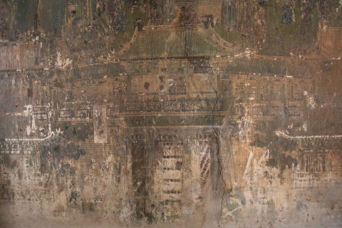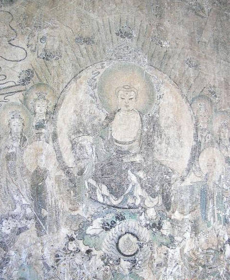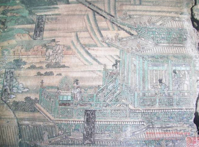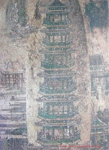 例如,东壁中央有一组富丽的宫廷建筑,主殿中波罗奈国王临朝执政,他头戴王冠,身着长袍,手捧腰间玉带端坐其中,侍女宫娥执扇后。殿内及阶下文武官吏捧 笏侍于两侧,仪卫整肃,群臣恭顺。此图真实反映了当时宫廷中君臣议事的情景。东壁北隅的鬼子母本生图中也有许多脱离佛教范畴的人间生活内容。例如,殿阁上 方一群嬉戏的婴儿或坐、或伏、或卧或仰、或倚、或游戏、或玩水,天真活泼,情趣自然,神色姿态个不相同。画面的上部,深山叠置,流云出没,丛林高峙,古树 掩映,清流曲泉自上而泻,似乎可以听见潺潺水声。驮物的驴子,沿蜿蜒山径徐徐而行,主人或于驴侧,或尾随驴后,吆喝着驴子赶路。目睹此景,深山雅趣油然而 生。东壁还有一幅水磨作坊图,构思周密,绘制精确,真实地表现了磨坊建于片石叠坎之上,有木阶梯做蹬道,旁侧有渠,下部装有水轮机构,清流奔泻,冲击着水 轮运转,水轮的中轴又带动磨面和滔米的机轮转动,齿轮交错,轴杆盘旋,整个水推磨坊的机械装置和结构方法清晰可辩,磨面滔米的过程表现得十分清楚。这样的 画作,如果没有多年的绘画功夫及对生活细微的观察,是不可能创作来的。