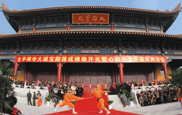 太平禅寺分两期建设,首期建成大雄宝殿、玉鉴楼、三圣堂、因果城、禅房等。其中,大雄宝殿投资1600余万元,建筑面积3360平方米。该殿坐北朝南,雄踞寺院中央,门额“大雄宝殿”四字,由已故全国佛教协会会长赵朴初亲笔题写。整个大雄宝殿建筑面积3360平方米,长46米,宽36米,高34.6米,琉璃覆顶,飞檐翘角,画栋雕梁,为江南晚清建筑风格,雄伟壮观,其规模在江浙沪县级寺庙中堪称首位。