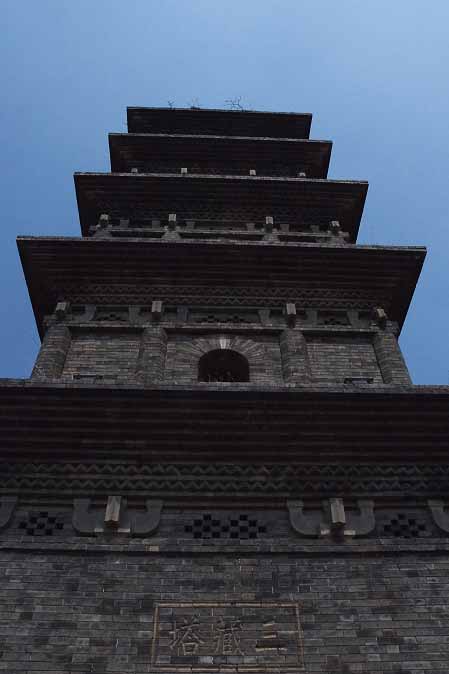 三藏塔建于1943年底,是一座五层楼阁式青砖塔。塔仿西安兴教寺玄奘塔(大雁塔)形式,塔的每层开辟有四扇拱形门,在第一层的南面塔壁上镌刻着“三藏塔”字样。
