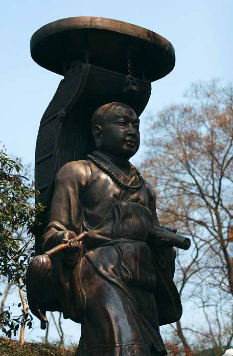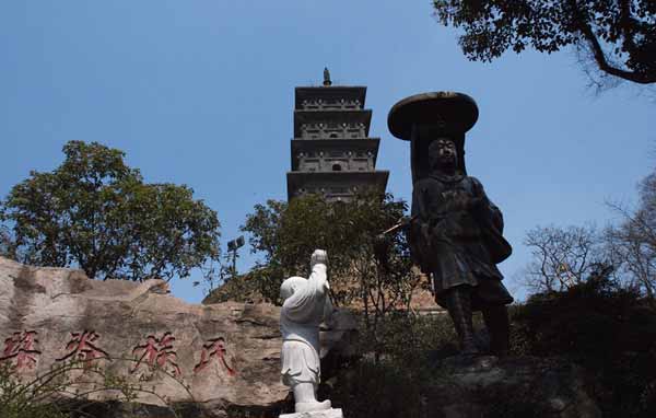 经过天井,有台阶通向九华山山顶。在山的半腰竖立着一尊玄奘全身负笈青铜塑像。铜像根据《玄奘负笈西行图》中玄奘的造型而塑造,玄奘身负古代装着书籍、衣物的箱子,也就是笈。在笈的前方悬挂着一盏小油灯,这是为了夜间便于赶路照明。