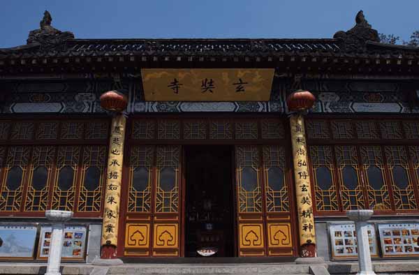 玄奘寺与九华山公园合二为一。公园的大门,即为玄奘寺的山门。由山门拾级而上,抬头就可以看到上面有一座仿古建筑,在建筑平台迎面处镌刻有“千古一完人”的丹书,题句系国学大师梁启超先生对玄奘大师的评价。玄奘殿就建在平台之上。玄奘殿是玄奘寺的前殿,也是寺院的临时法堂,平时寺院的重大法事都在此举行。殿内供奉着玄奘大师和他的两个弟子窥基、圆测的金身塑像。玄奘大师的塑像高2.23米,坐姿,面容安详。两侧站立着他的两位高徒窥基和圆测的塑像,高度都是1.98米。在塑像的上方,有一块由青年书法家王志华书写的朱底金字匾额“法门领袖”,这个评价对玄奘大师来说当之无愧。殿内四壁雕刻有玄奘西行取经故事壁画,反映玄奘西行漫长曲折取经经历的壁画。在玄奘塑像的正面,供奉着地藏菩萨金像,坐姿,其面容、造型与玄奘大师颇为相像,有人说地藏菩萨的塑像就是参照玄奘大师而造的。综观各寺院供奉的地藏菩萨像,的确与玄奘大师面容很像。
