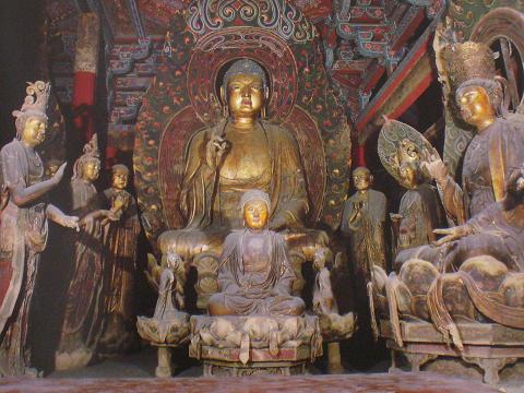 内槽彩画中所绘网目纹、三角柿蒂等辽代通行的纹样尚依稀可辨。佛坛上三尊主像顶部的藻井为不等边八角锥体,这样精巧的设计,一方面增大了佛像上部空间,同时又避免了天花板与佛像距离太近所产生的压抑感。