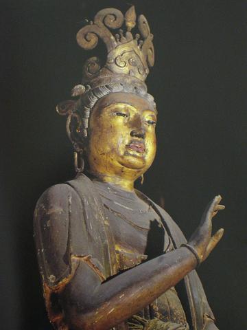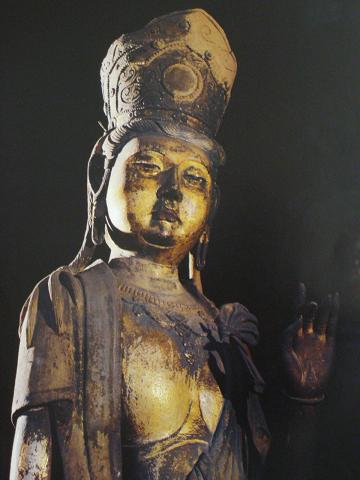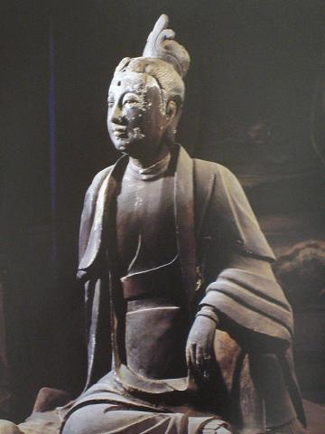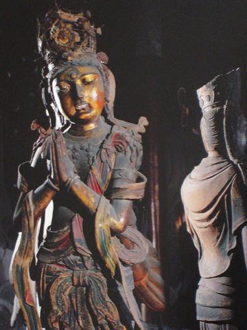 辽塑也是下华严寺的精彩之处。薄伽教藏殿内的气氛与 上华严寺大殿有很大不同,上华严寺大殿色彩鲜艳,金碧辉煌;薄伽教藏殿则庄严冷肃,古色古香。殿内宽阔的佛坛上布列辽代塑像31尊,中间为过去、现在、未 来三世佛,两侧的弟子、菩萨和供养童子分为3组,坐列相间,井然有序。中央的佛像慈祥庄重,端坐莲台,莲瓣上有沥粉贴金佛像,风格秀逸。四大菩萨娴静端 庄,慈容微露。特别是有一尊合掌露齿的胁侍菩萨身姿优雅,妩媚轻盈。郭沫若先生曾称道这尊菩萨是国内所有露齿菩萨中的精品。