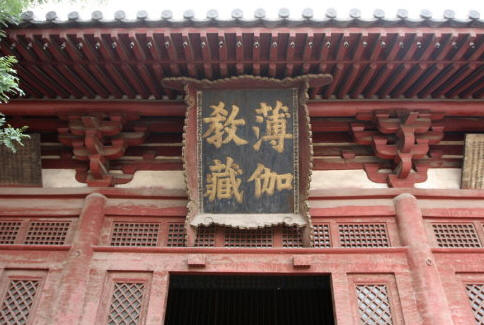 薄伽教藏殿为下寺大殿,“薄伽”为梵文音译,是“佛”的意思,“教藏”指经典,薄伽教藏殿就是存放佛经的地方。薄伽教藏殿面阔5间,25.65米,进深 4间,18.41米。单檐歇山式,正脊两端耸立着高3米的琉璃鸱吻,是金代重修时安装的。大殿屋顶坡度平滑,出檐1.2米,檐柱从左右次间升起至殿角,升 高显著,增加了殿宇的雄伟气魄。