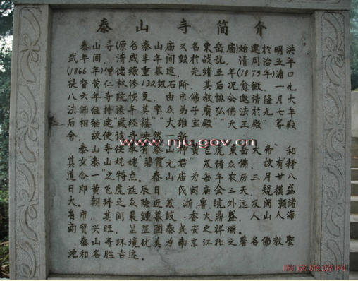 浦口泰山庙又叫“东岳庙”。始建于明初,后毁于清咸丰年间战火。清同治五年(1855)僧德缘重新募建,当时只有中殿和后殿,没有前殿。歇山造,后殿面阔五间21.2米,进深七檩8.9米,檐高5.6米。清光绪五年(1879),浦口防军提督黄士林命人从山脚到庙门口铺有132级台阶。1952年泰山庙悉遭破坏。1986年6月,浦口区政府将该庙移交给南京市佛教协会。市佛教协会先后拨专款10多万元,从山门至庙堂进行全面修缮。经市宗教局同意,市佛教协会将泰山庙改名为“泰山寺”,专派尼师隆月师太主持庙务,恢复教务活动。1996年新建藏经楼,1999年重建山门和新建山西边围墙,同年底东廊房、内院墙开工建设。