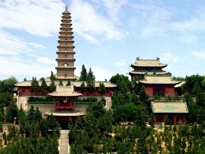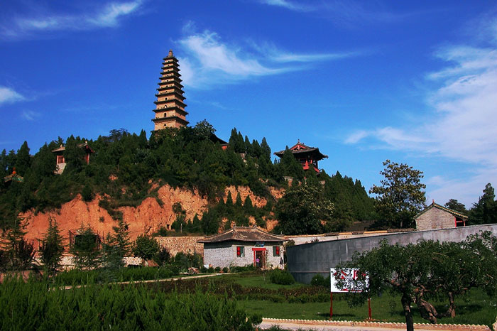 莺莺塔在明嘉靖三十四的那次大地震中也被毁掉了,现今我们看到的,是公元1563年重修的。塔内外呈四方形,塔檐呈微凹的曲线形式,这些都说明莺莺塔保留了某些唐塔的特征。