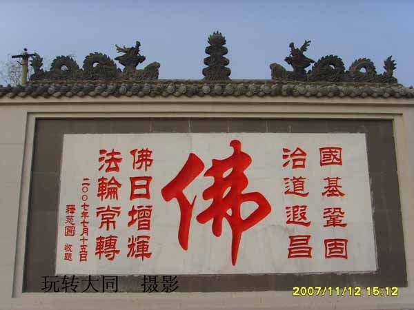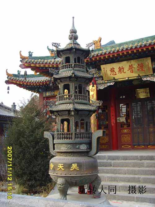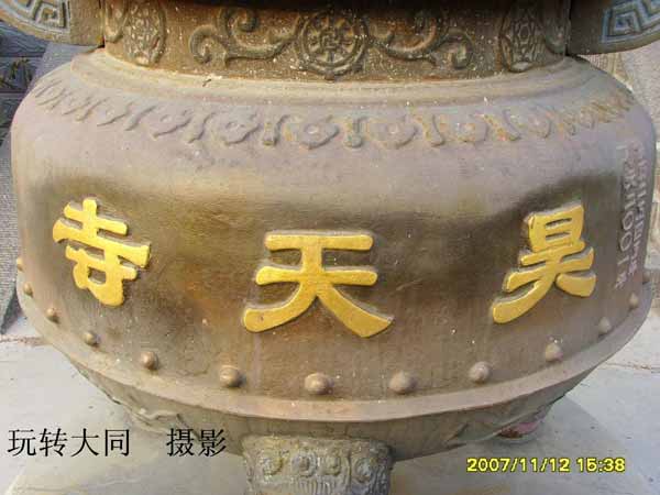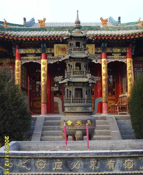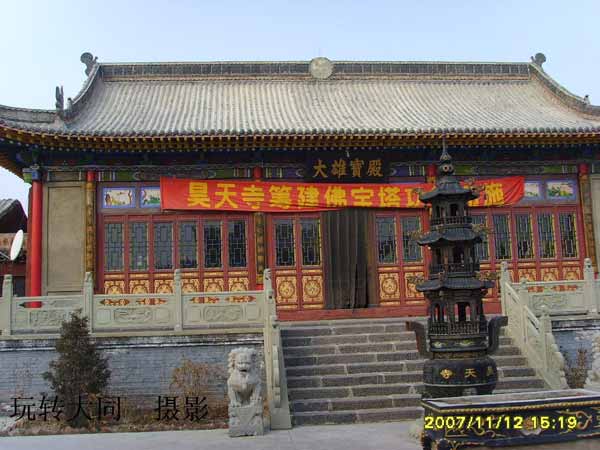 昊天寺,在大同县城北1.5公里。多说建于北魏,早于大同华严寺。曾于明万历年间创修。又于七十年代初被毁。八十年 代重修,现有面积20000多平米,建筑面积5000多平米。七十年代前,寺中有碑五幢。最早的为明万历二年《昊天寺创修碑》,碑文云:“昊天宝刹不知修 于何年,为捐身寺。” 为一充军发配到此的囚犯始建, 所有砖料均由羊群驮运至山上。并担任住持。此均碑中记载。