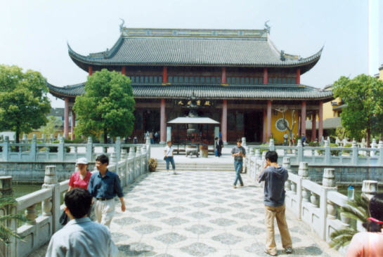 过拱桥可直抵指归阁,三进为大雄宝殿,飞檐翘角,轩廊环绕。屋高十八公尺,项脊上“佛光普照”四个大字闪闪发光。梅、兰、竹、菊砖雕构图别致,精细秀逸。步入殿堂,无数宝相庄严的大佛小佛重重叠叠,从四面八方扑面而来,如临佛国。