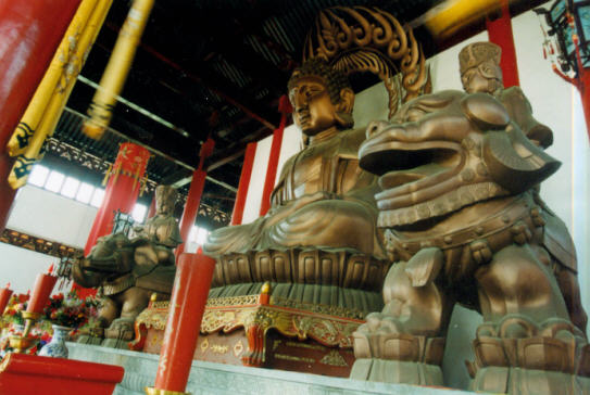 第三进为全寺主体建筑大雄宝殿,飞檐翘角,轩廓环绕,屋高18米,项脊上“佛光普照”四个大字闪闪发光,梅、兰、竹、菊砖雕构图别致,精细秀逸,步人殿堂-无数宝相庄严的大佛小佛重重叠叠从四面八方扑面而来,如临佛国,殿正中供奉佛祖释迦牟尼铜座像,高5米,重3吨。两侧文殊、普贤分别骑跨在雄狮、大象上,气慨英武。殿后背面是飘海观音,屹立在鳌鱼之背,大殿两旁的十八罗汉各具神态,形貌如生,全殿神光闪耀,祥云缭绕,佛像优美,更觉佛教文化艺术情味浓郁。