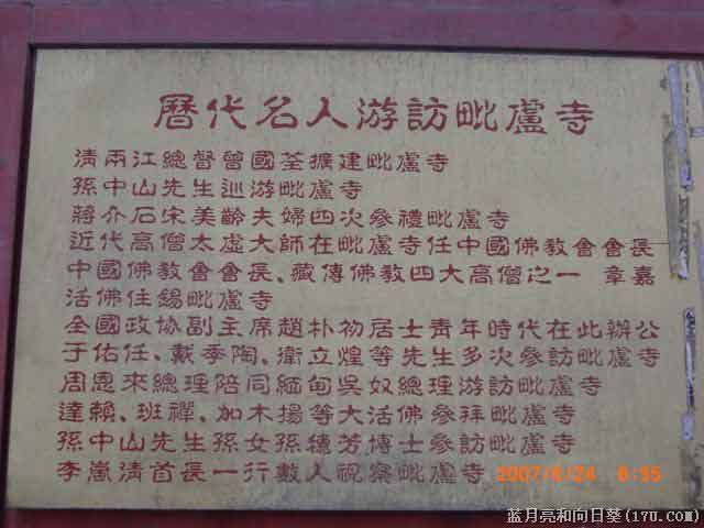 毗卢寺建好后,谁来做第一任住持,说来还有一段传说,清同治年间,曾国荃在南岳衡山游览时,曾遇海峰法师,两人相谈甚是投机,临别时,曾国荃与海峰戏曰:“如我督两江,为汝造庵”,毗卢寺修建好后,曾氏想起这段戏约,遂遣人请海峰就任。