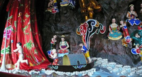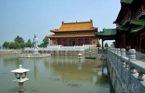 它是全国最大的水上佛都胜地,以其悠久的历史闻名海内外。上方寺原是中国佛教禅宗、临济宗磬山派的嫡传法脉,祖庭为浙江天目山报恩寺,初建于明朝崇祯年间。经历代大德高僧苦心经营,建成殿、堂、楼、房、舍300余间,殿阁巍焕、佛像庄严,钟鼓梵呗之声不绝于耳。如今上方寺占地150多亩,周围有碧波荡漾的数千亩水面环抱。穿过山门,汨汨溪流上一座石拱桥将游人引入天王殿,殿后便是波涌青莲的大士放生池。池中一座海鸟拱起须弥莲座,莲座上10多米高的观音玉石雕像慈目低垂,俯视芸芸众生。大士身后,平地崇起一座丹墀月台,上下两层白玉石雕拱护着一座重檐飞角、巍巍庄严的大雄宝殿。