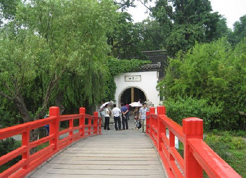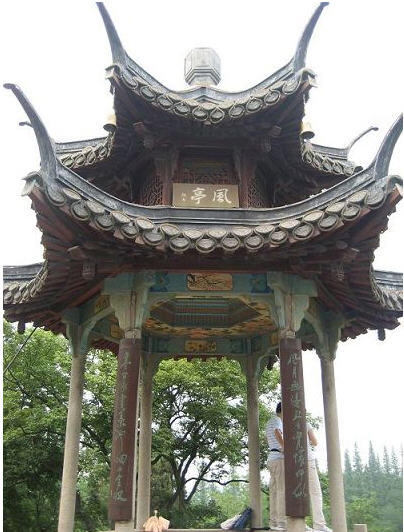 过此西行,就到琴室了。由月观北行十数步,有一岭拔地而起。岭之南麓,造一座垣门,上嵌“梅岭春深”四字额,为刘溎年所书。由垣门可拾级登山,山顶置一亭,名曰风亭。南望全城,北眺蜀冈,维扬城郊风景尽收眼底。往昔岭上,遍地植梅,今梅树寥落,松竹茂盛。是岭高数丈,岭前岭后,岭左岭右,皆有山路,宛然曲折,形势险峻,诚为湖山胜处。是岭全系出自人工,筑于清代乾隆年间,费时三年而成,费金二十余万,为扬州北郊二十四景之一。笔者三人拾级而上,登上风亭,坐在栏杆上,听着那铁马叮咚声,便觉清风徐来,不由使人联系到“风月无边,到此胸怀何似;亭台依旧,羡他烟水全收”的意境来了。