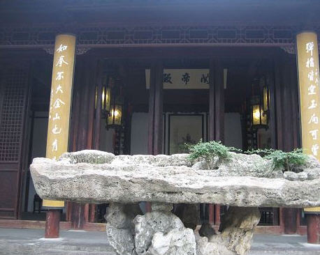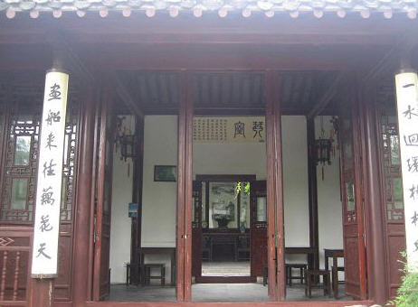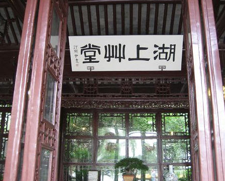 由观音阁原路出来,循级而下,两折至湖上草堂。堂屋三间,面西而坐。明间后身,加一间抱厦,前檐加一架卷棚,在堂屋明间上面,悬一块横匾,上有伊秉绶书“湖上草堂”四字。汪翁道:“其地尚有皖派金石名家邓石如撰书的‘四围积奇石几层,月色夹空,如窥古涧;其地有高松百尺,绿荫翳目,时到异人’楹联一副,今已不知去向。”