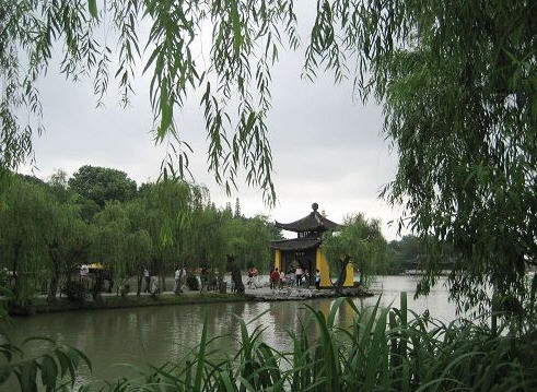 笑罢,由前山石径,循级而西。过后梁,抵观音阁,阁面西而筑,阁前植松两株,虽非百年老树,倒也虬枝铁杆,聊具古意。如前所说的砚耕女史,于五十年代初始,曾寄寓此间。在阁之西更有半亭一座,依门而立,游人至此,倚栏而坐,凭栏而望,南为湖上草堂,西为绿荫馆。更远处,水波不兴,鱼跃涟漪,以此处湖面,最为开阔不过。在亭之下,有洞两曲,名玉佛洞,除可供人摸索一番而外,别无佳胜可言。