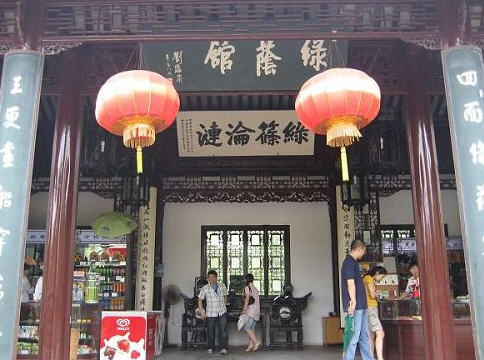 绿荫馆与湖上草堂的格局约莫相似,所不同者,只是方向变为坐北朝南。馆中悬一块“绿筱沦涟”四字匾额。其上跋云:“此处旧名绿荫馆,二分竹,三分水,致佳境也。”今日此地,“绿荫”皆除,“绿筱”无影,惟有“沦涟”无恙,“三分水”未少一分。江君道:“若以观察陈公楹联‘四面绿荫少红日,三更画船穿藕花’观之,绿荫馆畔,‘于夏日一唱招凉曲’尚可,因有‘堤岸莺花桥畔月’,惟独不可作‘四面绿荫’来对待,否则就要汗沾沾然了。好在现时馆里设有茶座,可以任人逗留,或是歇歇足,屈屈腿,也是一件很为快意的事情。”