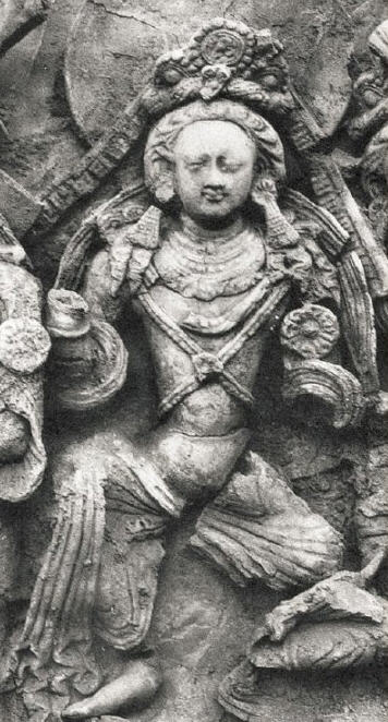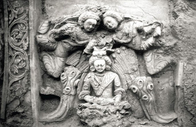 尚阇梨仙人浮雕。画面中央一人物,双手放于腹部,盘腿而坐,头上有两只鸟正在做窝,其上有两飞天环绕。当中一人即尚阇梨仙人。关于尚阇梨仙人, 佛典载“问曰:禅波罗蜜云何满?答曰:如一切外道禅定中得自在。又如尚阇梨仙人坐禅时无出入息,鸟于螺髻中生子不动不摇,乃至鸟子飞去……”