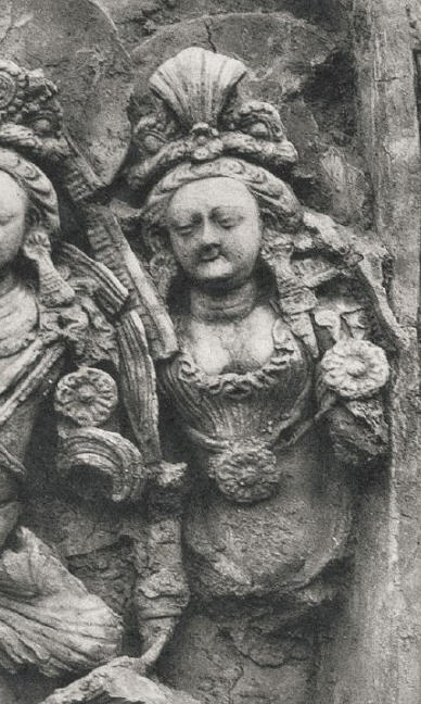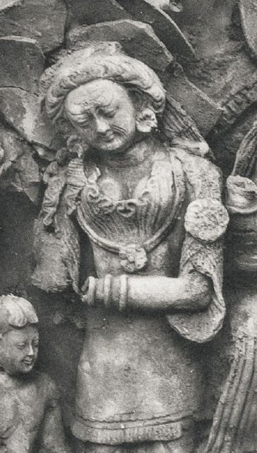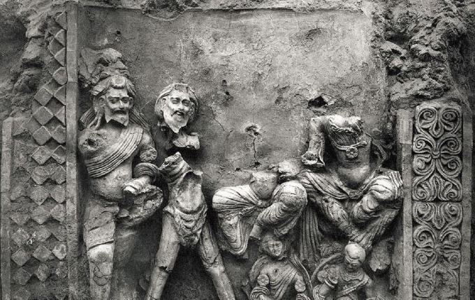 须大拏太子本生浮雕。画面左边为两个上身赤裸、留大胡须的人物,此即向须大拏太子讨要孩子的婆罗门。右边有四个人物,上面为一对男女,脚下有两个小孩,此即须大拏太子和他的夫人及他们的孩子们。画面表现的是太子亲手捆绑孩子并布施给婆罗门的场景。