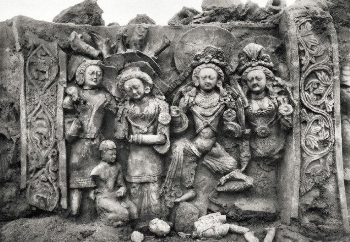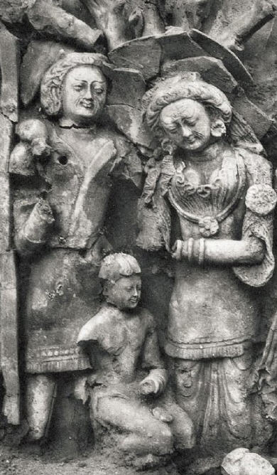 须阇提太子本生浮雕。画面左边三个人物,站立一对男女,面容哀伤,似在流泪,此即须阇提太子的父母。一个孩子跪在这对男女前面,表情平静,此即 须阇提太子。表现太子正跪在父母脚下,准备贡献自己的肉身或者恢复肉体时的场面。右边的两位菩萨,似为被太子感化而下凡协助太子的帝释天和诸天。