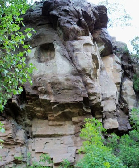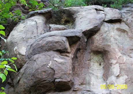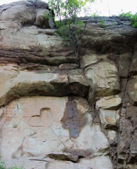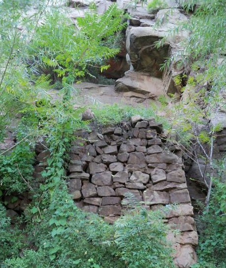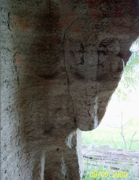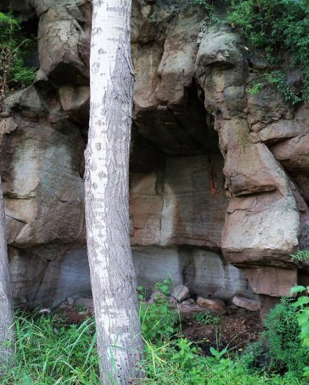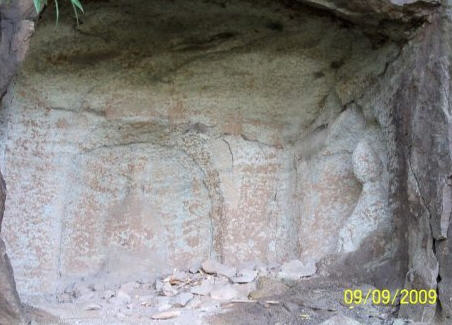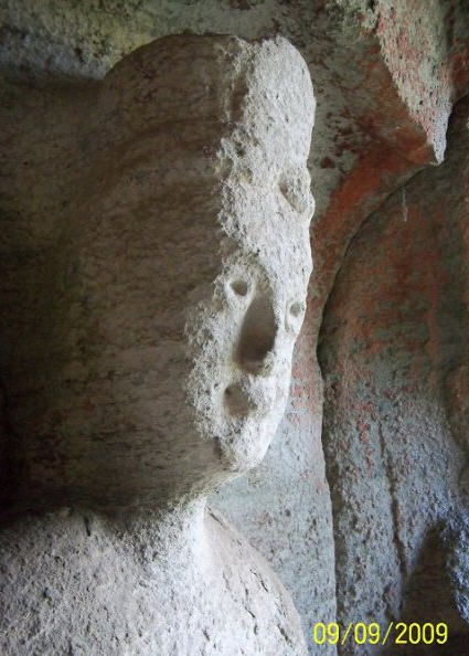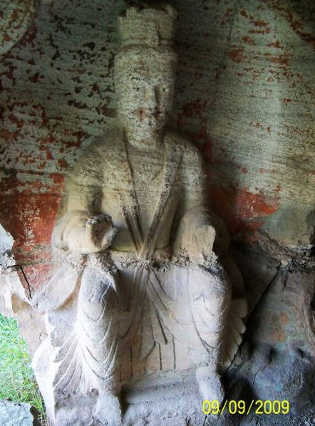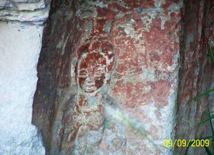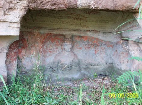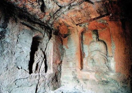 第二窟开凿于地面,三米见方。窟中已无造像,但是三面石壁上均有龛迹,而且三壁均残留红色印记。细参石壁上并无斧凿印痕,估计是自然损毁,而非被盗。但是同时开凿的石窟,为何他窟尚有造像而此窟造像竟然些许无存呢?也许当初此窟内并非石刻造像,而只是塑像!