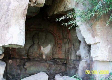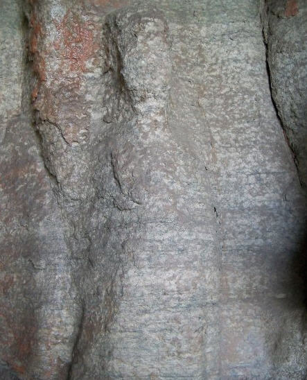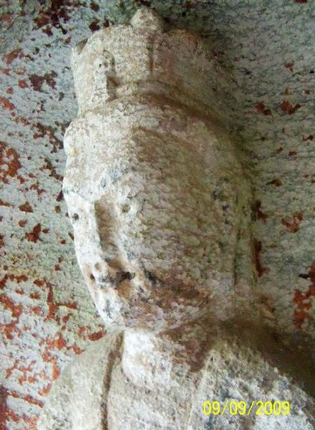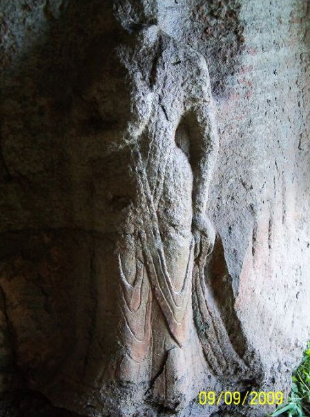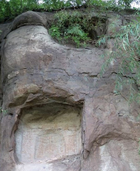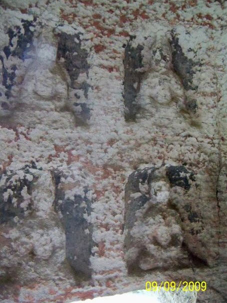 第三窟紧挨第二窟,是一矮窟,紧贴“地面”,窟高约50厘米,方形穹窿顶,三壁皆造像。但是由于“地面”潮湿,风化严重,造像只有大致模样了!